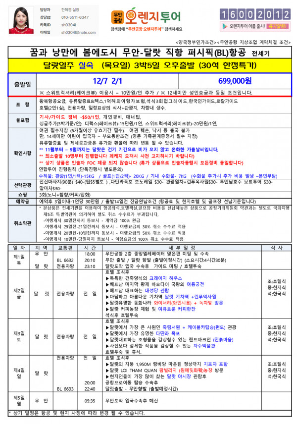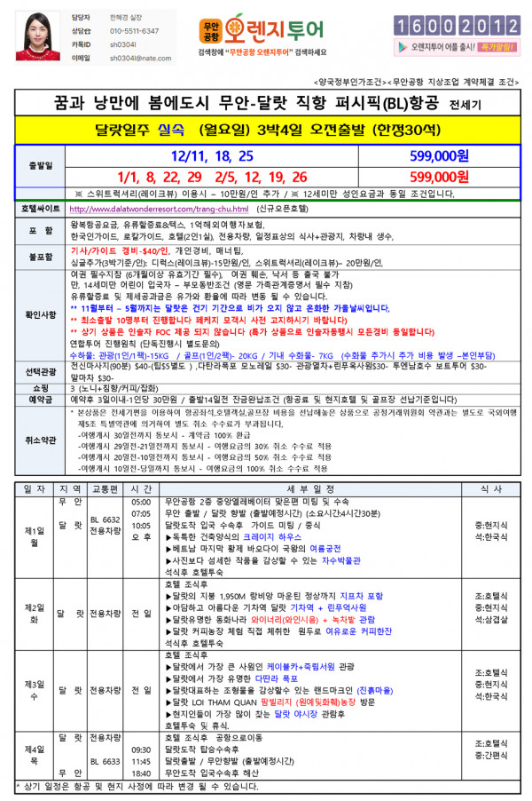 '주식회사 오렌지'는 (이하 '회사'는) 고객님의 개인정보를 중요시하며, "정보통신망 이용촉진 및 정보보호"에 관한 법률을 준수하고 있습니다. 회사는 개인정보취급방침을 통하여 고객님께서 제공하시는 개인정보가 어떠한 용도와 방식으로 이용되고 있으며, 개인정보보호를 위해 어떠한 조치가 취해지고 있는지 알려드립니다. 회사는 개인정보취급방침을 개정하는 경우 웹사이트 공지사항(또는 개별공지)을 통하여 공지할 것입니다. 수집하는 개인정보 항목 예약, 상담, 서비스 신청 등을 위해 아래와 같은 개인정보를 수집하고 있습니다. ο 수집항목 : 출발일, 예약자, 인원 , 연락처, 접속 IP 정보, 개인정보처리방침 및 수집 동의 내용 ο 개인정보 수집방법 : 홈페이지 수집 개인정보의 수집 및 이용목적 회사는 수집한 개인정보를 다음의 목적을 위해 활용합니다. ο 여행상품 예약관련 상담 서비스에 이용 개인정보의 보유 및 이용기간 원칙적으로, 개인정보 수집 및 이용목적이 달성된 후에는 해당 정보를 지체 없이 파기합니다. 단, 다음의 정보에 대해서는 명시한 기간 동안 보존합니다. 보존 항목 : 출발일, 성명(예약자), 인원 , 연락처, 접속 IP 정보, 개인정보처리방침 및 수집 동의 내용 보존 근거 : 고객상담 관리 보존 기간 : 1년 개인정보의 파기절차 및 방법 회사는 원칙적으로 개인정보 수집 및 이용목적이 달성된 후에는 해당 정보를 지체없이 파기합니다. 파기절차 및 방법은 다음과 같습니다. ο 상담문의를 위해 입력하신 정보는 목적이 달성된 후 별도의 DB로 옮겨져(종이의 경우 별도의 서류함) 내부 방침 및 기타 관련 법령에 의한 정보보호 사유에 따라(보유 및 이용기간 참조) 일정 기간 저장된 후 파기되어집니다. 별도 DB로 옮겨진 개인정보는 법률에 의한 경우가 아니고서는 보유되어지는 이외의 다른 목적으로 이용되지 않습니다. ο 파기방법 - 전자적 파일형태로 저장된 개인정보는 기록을 재생할 수 없는 기술적 방법을 사용하여 삭제합니다. - 종이에 출력된 개인정보는 분쇄기로 분쇄하거나 소각을 통하여 파기합니다. 개인정보 제공 회사는 이용자의 개인정보를 외부에 제공하지 않습니다. 수집한 개인정보의 위탁 회사는 고객님의 동의없이 고객님의 정보를 외부 업체에 위탁하지 않습니다. 쿠키(Cookie)를 설치, 운영하고 있는 이용자는 이를 거부할 수 있습니다. 쿠키는 이용자에게 보다 빠르고 편리한 웹사이트 사용을 지원하고 맞춤형 서비스를 제공하기 위해 사용됩니다. ο 쿠키란 무엇일까요? 쿠키란 웹사이트를 운영하는데 이용되는 서버가 이용자의 브라우저에 보내는 아주 작은 텍스트 파일로서 이용자의 컴퓨터에 저장됩니다. ο 쿠키를 왜 사용하나요? 쿠키를 통해 이용자가 선호하는 설정 등을 저장하여 이용자에게 보다 빠른 웹 환경을 지원하며, 편리한 이용을 위해 서비스 개선에 활용합니다. 이를 통해 이용자는 보다 손쉽게 서비스를 이용할 수 있게 됩니다. 또한 여러 서비스의 접속 빈도, 방문 시간, 각종 이벤트 참여 정도, 방문 회수 등을 분석하여 이용자의 취향과 관심분야를 파악합니다. 이를 바탕으로 광고를 포함한 개인 맞춤형 서비스를 제공합니다. ο 쿠키를 수집하지 못하게 거부하고 싶다면? 이용자는 쿠키 설치에 대한 선택권을 가지고 있습니다. 따라서, 이용자는 웹 브라우저에서 옵션을 설정함으로써 모든 쿠키를 허용하거나, 쿠키가 저장될 때마다 확인을 거치거나, 모든 쿠키의 저장을 거부할 수도 있습니다. 다만 쿠키 설치를 거부할 경우 웹 사용이 불편해지며 로그인이 필요한 일부 서비스 이용에 어려움이 있을 수 있습니다. 설정 방법의 예 1) Internet Explorer의 경우 : 웹 브라우저 상단의 도구 메뉴 > 인터넷 옵션 > 개인정보 > 설정 2) Chrome의 경우 : 웹 브라우저 우측의 설정 메뉴 > 화면 하단의 고급 설정 표시 > 개인정보의 콘텐츠 설정 버튼 > 쿠키 개인정보에 관한 민원서비스 회사는 고객의 개인정보를 보호하고 개인정보와 관련한 불만을 처리하기 위하여 아래와 같이 관련 부서 및 개인정보관리책임자를 지정하고 있습니다. 고객서비스담당 부서 : 고객관리 전화번호 : 1600-2012 이메일 : sh0304l@nate.com 개인정보관리책임자 성명 : 한혜경 전화번호 : 1600-2012 이메일 : sh0304l@nate.com 귀하께서는 회사의 서비스를 이용하시며 발생하는 모든 개인정보보호 관련 민원을 개인정보관리책임자 혹은 담당부서로 신고하실 수 있습니다. 회사는 이용자들의 신고사항에 대해 신속하게 충분한 답변을 드릴 것입니다. 기타 개인정보침해에 대한 신고나 상담이 필요하신 경우에는 아래 기관에 문의하시기 바랍니다. 1.개인분쟁조정위원회 (www.1336.or.kr/1336) 2.정보보호마크인증위원회 (www.eprivacy.or.kr/02-580-0533~4) 3.대검찰청 인터넷범죄수사센터 (http://icic.sppo.go.kr/02-3480-3600) 4.경찰청 사이버테러대응센터 (www.ctrc.go.kr/02-392-0330)