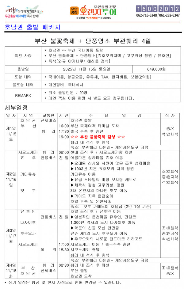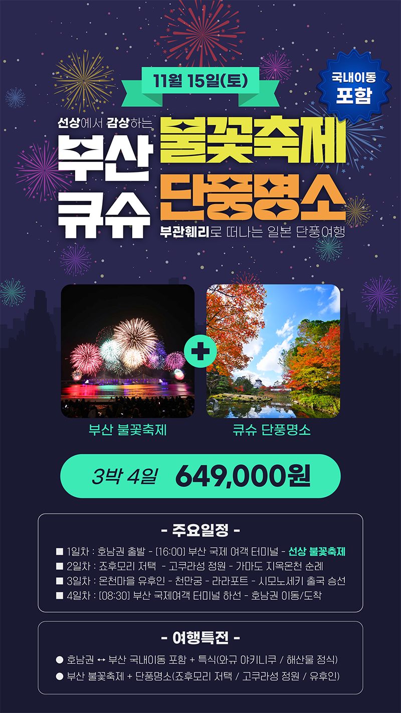 [광주출도착]11월15일 부산불꽃축제+일본 단풍여행 특가 - [예약마감]