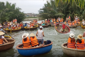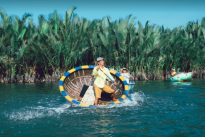 바구니배를 타고 코코넛 숲이 우거진 수로를 지나 한바퀴 돌아보는 뱃놀이. 둥근 소쿠리처럼 생긴 광주리배는 베트남 전통 대나무로 만든 것이다.